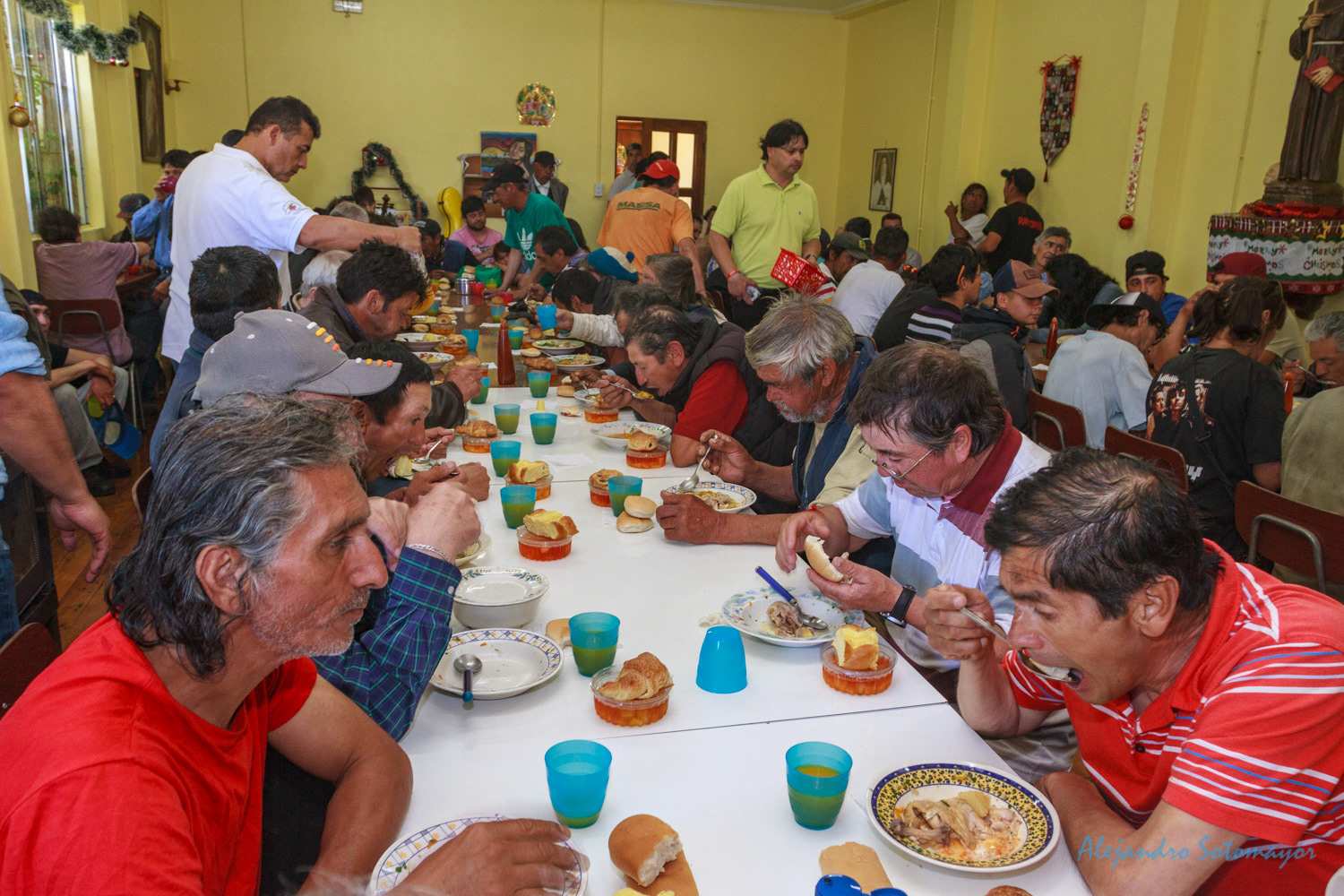 Hoy, 26 años más tarde, vuelvo al restaurado comedor -un incendio ocurrido en Agosto de 2013 lo destruyó casi por completo- para encontrarme con personas extraordinarias que mantienen este espacio funcionando y atendiendo de manera desinteresada a más de cien personas que buscan cada domingo un plato de comida y también un lugar para reunirse con los amigos, los amigos que poco tienen. La primera persona que saludo es Maria Garcia (68) quien revuelve una olla con cazuela. María y Cecilia Lara son las encargadas del comedor y destinan sus horas libres para recibir las donaciones y coordinar la logística para que cada domingo no falte nada y todo sea perfecto (y así es).